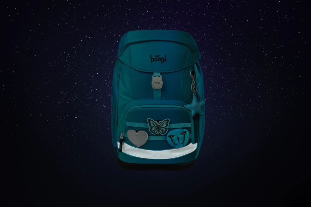 Det enkeltlags penalhus med YKK-lynlås, lille lomme til småting og vindue til skema leveres uden indhold og rummer takket være stærke elastikker også trekantede farveblyanter. Den stilfulde pose i samme design passer til idrætstøj eller skiftesko. Hele sættet prydes af et sommerfuglemotiv og mulighed for personliggørelse med udskiftelige badges (Baaglies).