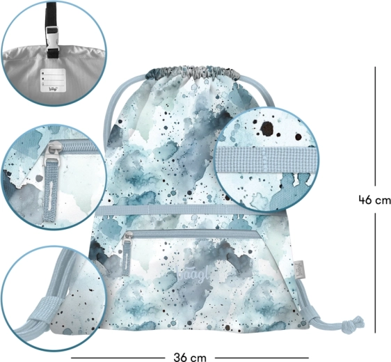 Takket være det robuste og aftørbare materiale tåler den daglig brug. Kraftige snørelukninger gør den behagelig at bære på ryggen, og den praktiske strop med spænde sikrer nem fastgørelse til rygsæk eller skoletaske.