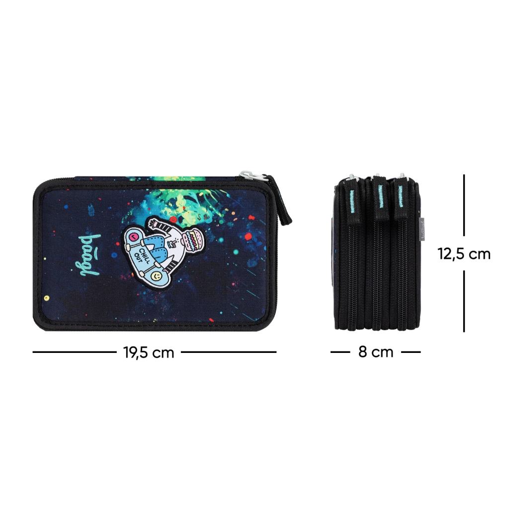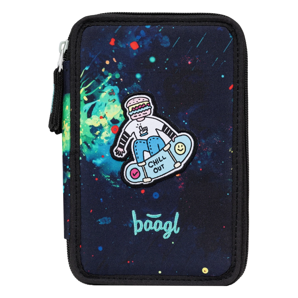 Stilfuldt og praktisk tredelt penalhus Baagl Chill tilbyder ekstra rummelig indretning til alle skriveredskaber. Takket være elastikker til tykke farveblyanter og tuscher, forstærket ryg for nem lukning og pålidelige YKK-lynlåse er det et ideelt valg til skoleelever. Det har GRS-certificering og leveres uden indhold.
