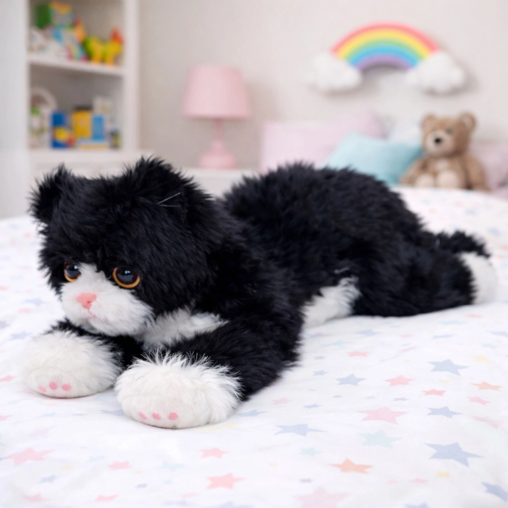 Den søde plyskat i sort‑hvid er blød, behagelig og klar til at blive krammet. Takket være det realistiske design, den silkebløde pels og sikre, behagelige materialer vil børn hurtigt elske den som ven til leg og søvn.