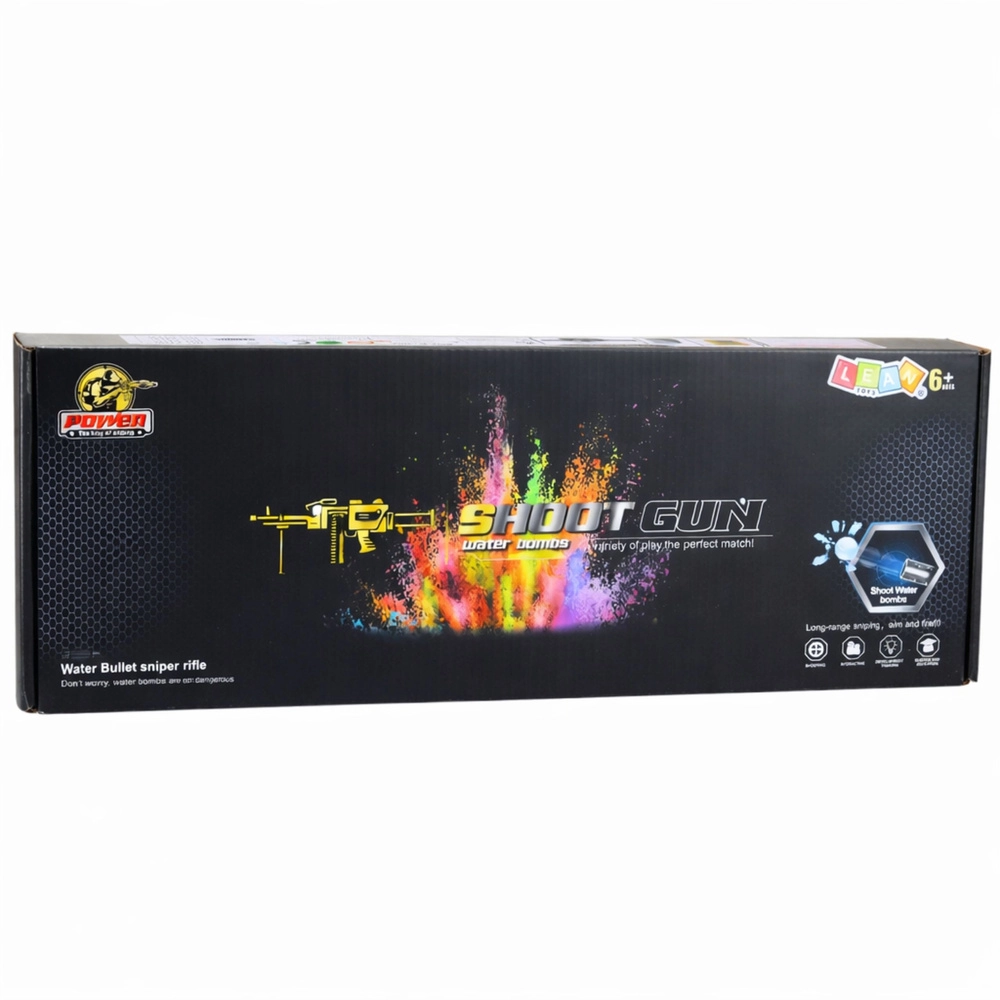 rifle, magasin, bipod, kikkertsigte, lyddæmper, 500 stk. gelkugler, farverig emballage