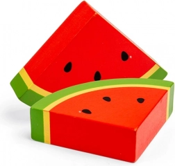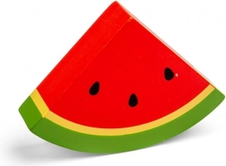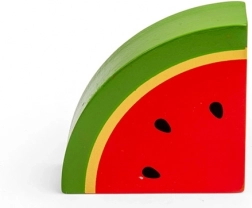 Denne træskive af vandmelon skiller sig ud med kraftige farver og realistisk udførelse. Den er ideel til legekøkken, butik eller som tilbehør til madlavningslege. Understøtter finmotorik, fantasi og sproglig udvikling, når man navngiver fødevarer.