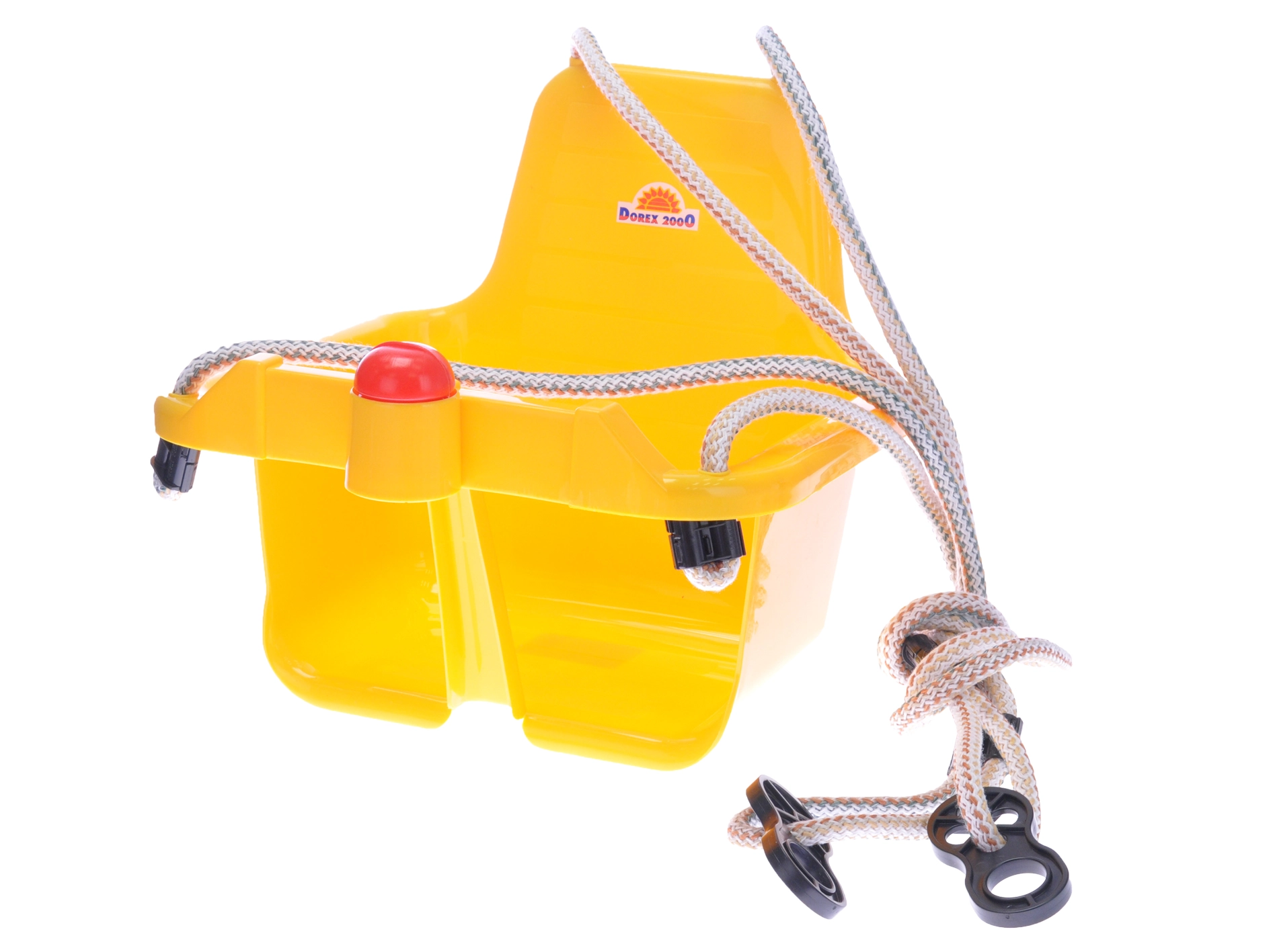 Den gule børneswing med horn giver sikker og sjov gyngning til de mindste. Takket være den stærke frontbøjle og den stabile konstruktion er den ideel til børn fra 18 måneder. Maksimal belastning 20 kg.