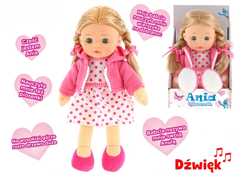 Dukken Ania er designet til de mindste, som vil sætte pris på den behageligt bløde krop og de realistiske detaljer. Takket være polsktalende fraser og lyde understøtter den på legende vis udviklingen af sproglig forståelse og sociale færdigheder. De blinkende øjne og det stilfulde tøj forstærker den realistiske legeoplevelse.