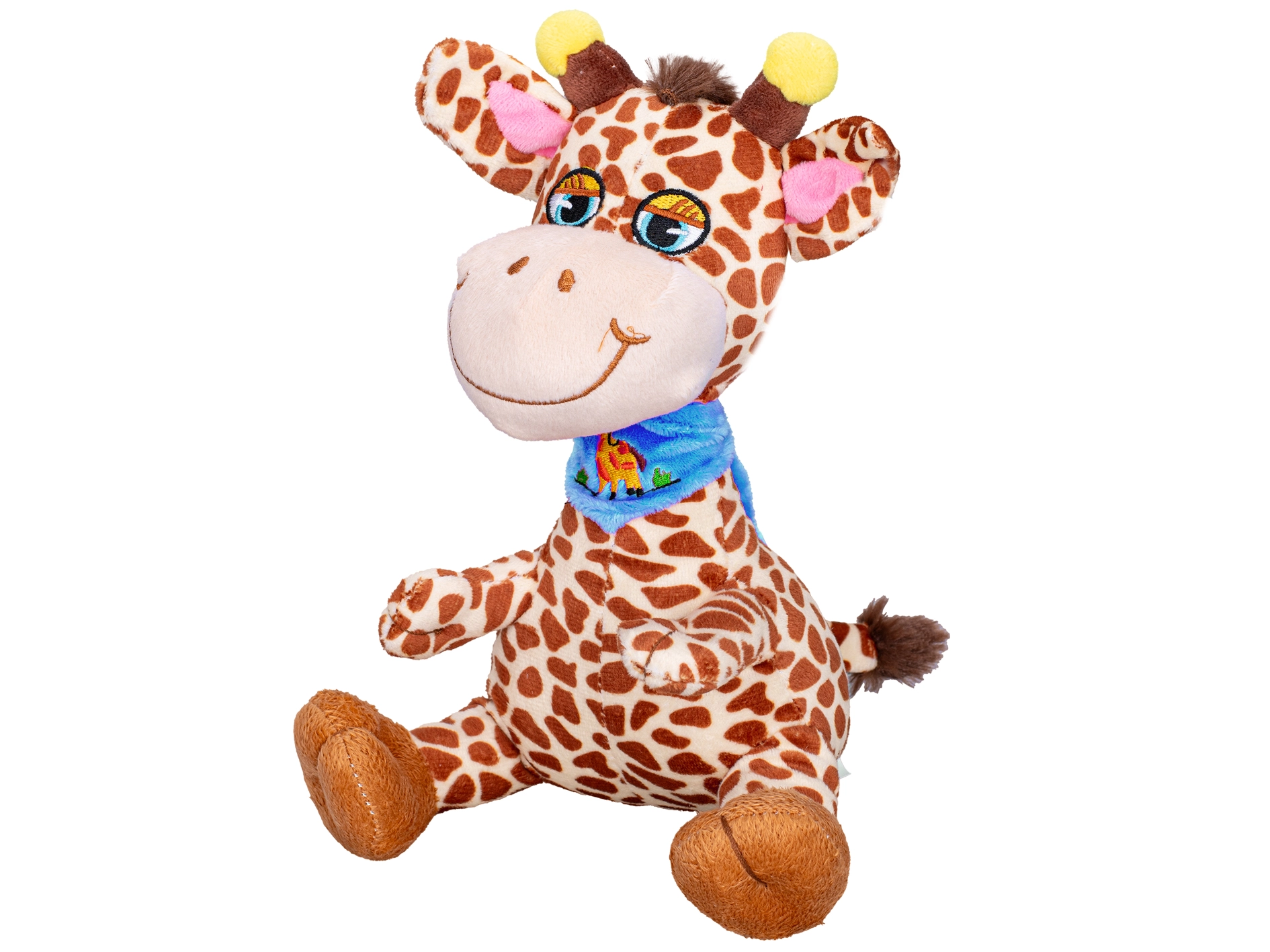 En sød plysbamse-giraf på 20 cm er den ideelle første legeting til de allermindste. Den er lavet af blød og behagelig plys, har et glad smil og et stabilt siddende design. Fås i to varianter med tørklæde – blåt eller lyserødt – for nemt valg efter smag. Velegnet fra fødslen og perfekt til kram og på farten.