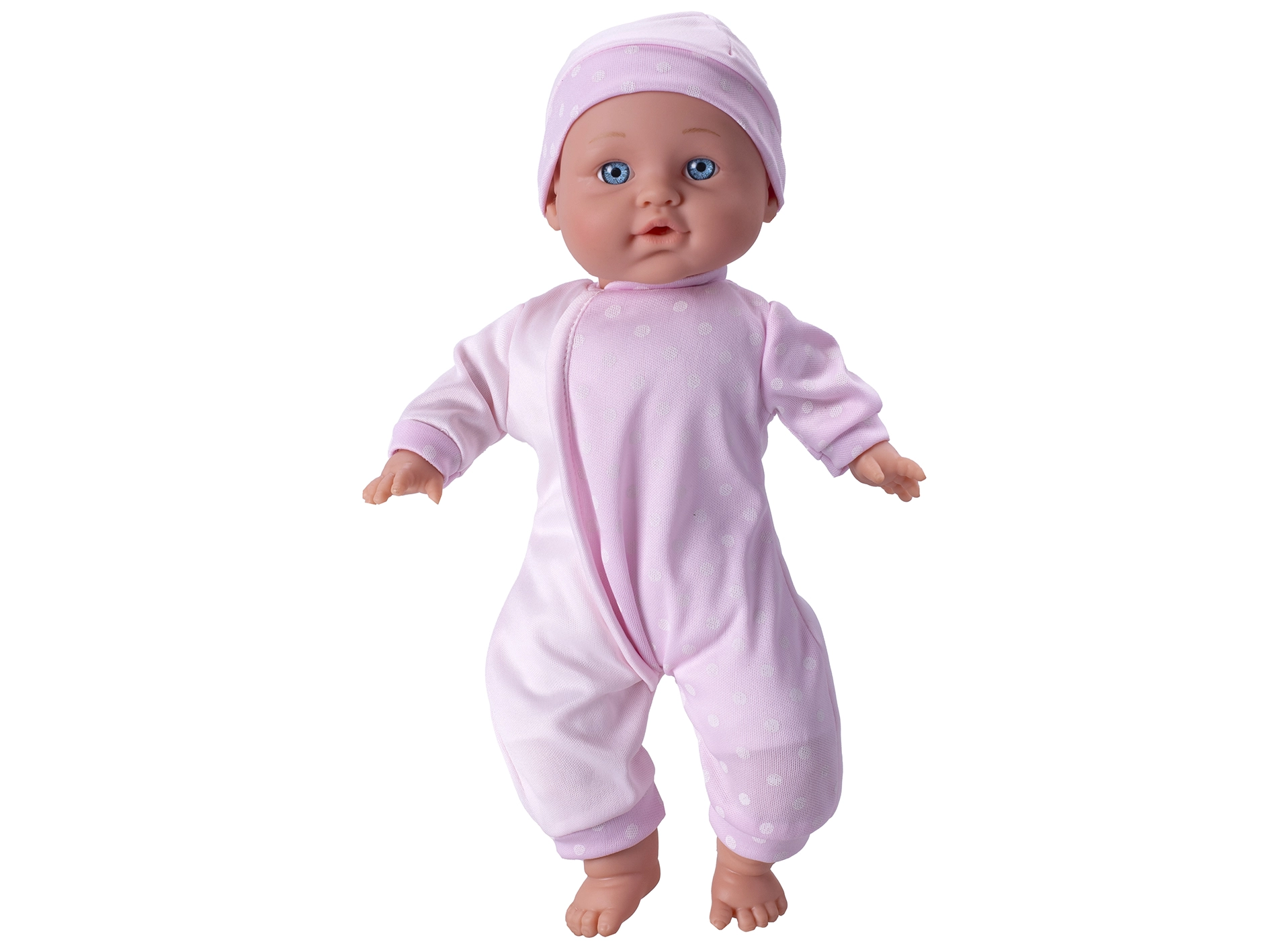 Sød babydukke med blød krop i størrelsen 30 cm er den ideelle legeting for små piger. Takket være det lette og nemt grebvenlige design passer den perfekt i børnehænder. Dukken er klædt i et lyserødt sæt med hue, så den er ikke kun skøn til leg, men også som dekoration på børneværelset.