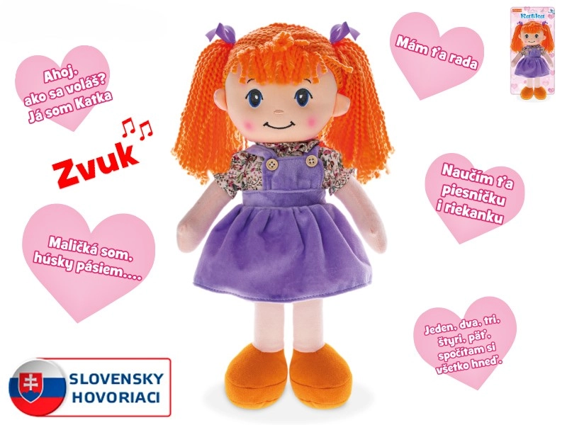 Dukken Katka vil fascinere børn med sit rødlige hår og sit søde udtryk. Takket være den bløde plysudførelse er den behagelig at røre ved og sikker til børns kram allerede fra de første dage. Ved at trykke på maven begynder hun at tale og synge på slovakisk – remser, sange og venlige fraser understøtter udvikling af sproglige færdigheder samt fornemmelse for rytme og lyde.