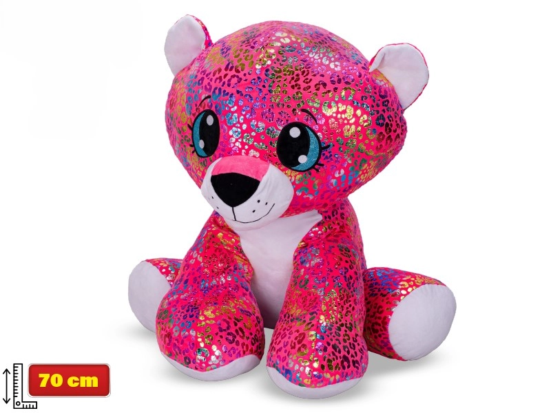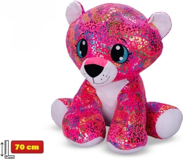En sød plyseleopard med regnbuefarver og glitrende detaljer på ører og poter, som vinder børns hjerter ved første blik. Med en siddehøjde på 70 cm er den ideel både til kram og som pynt på børneværelset. Den bløde, kvalitetsplys sikrer maksimal komfort og tryg leg for børn fra 3 år.