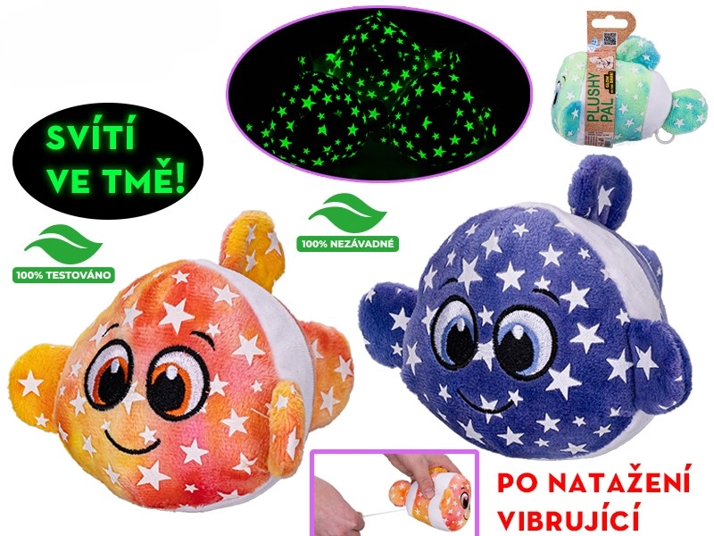 Den søde plysfisk på 10 cm er en blød og sikker ledsager til babyer fra fødslen. Når den trækkes ud, vibrerer den blidt, og dens fosforescerende detaljer lyser i mørke, hvilket virker beroligende og hjælper ved sengetid. Fås i tre farver – grøn, lilla og orange – passer nemt i barnesengen og barnevognen og stimulerer naturligt sanser og motorik hos de mindste.