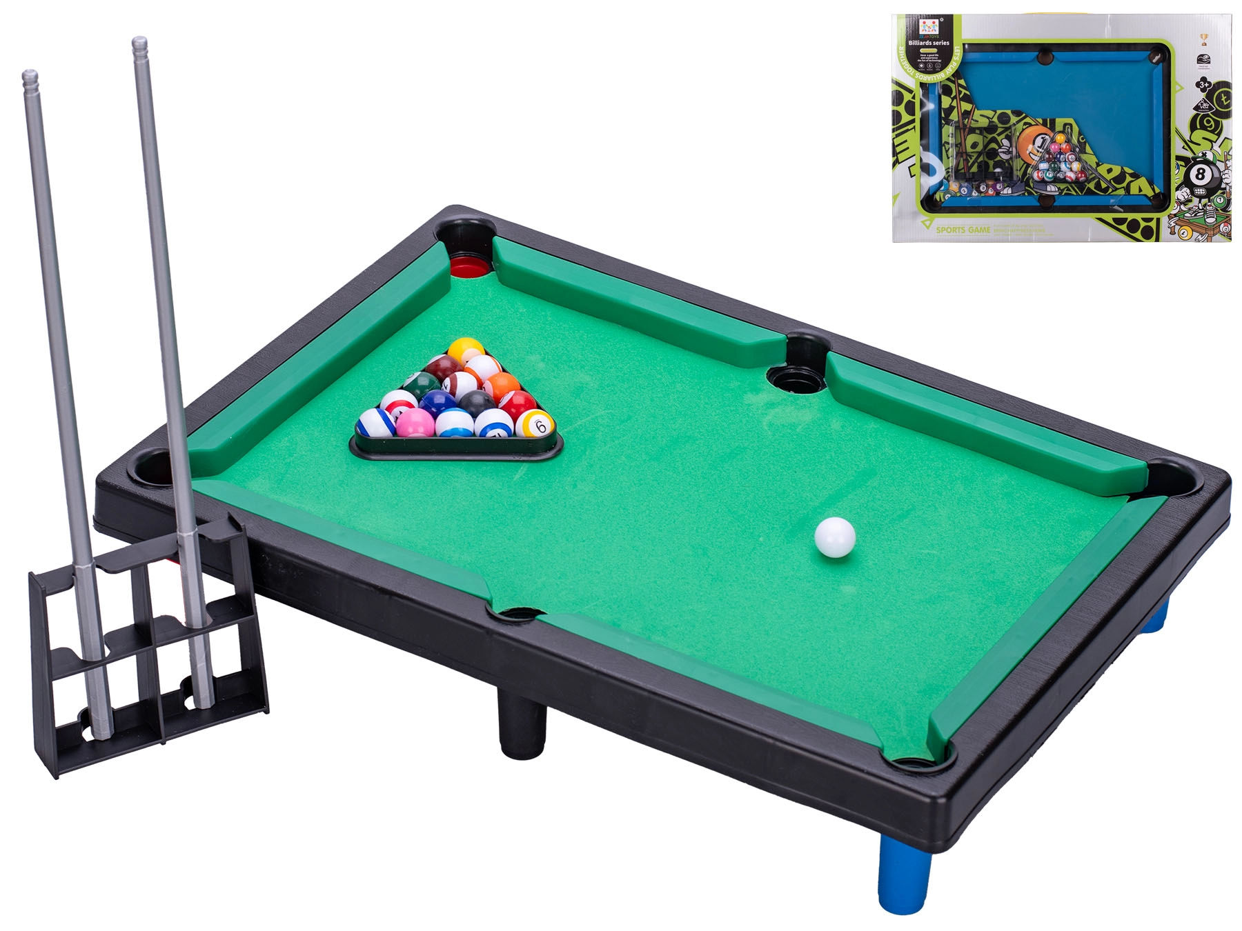 Kompakt bordbillard med målene 41,5 × 28,5 cm bringer sjov til enhver husstand. Takket være nem placering på bordet kan du spille når som helst og hvor som helst uden behov for meget plads. Sættet indeholder 2 køer og 16 kugler til et komplet spil for to spillere. Velegnet til børn fra 3 år, fås i 2 farver – grøn og blå.