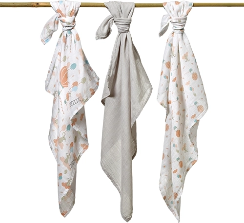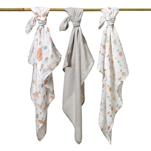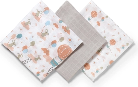 Det praktiske sæt med 3 styk kombinerer to bleer med et blidt pastelfarvet motiv af dyr og balloner samt én ensfarvet i en grå tone, så de nemt matcher udstyret. Bleerne er lette, tørrer hurtigt og er nemme at vedligeholde. For at bevare blødheden anbefales skånsom vask efter producentens anvisninger.