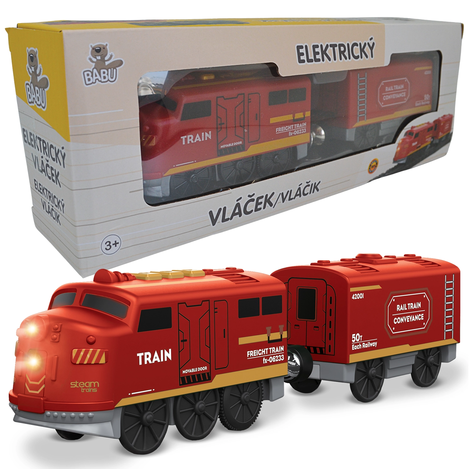 Rødt elektrisk tog BABU i et praktisk 2-delt sæt begejstrer små lokomotivførere med realistiske lys- og lydeffekter, kørsel frem og tilbage samt en sikker STOP-funktion. Takket være magnetiske koblinger tilkobles det nemt, er lavet af kvalitetsplast og understøtter finmotorik, logisk tænkning og kreativ leg.