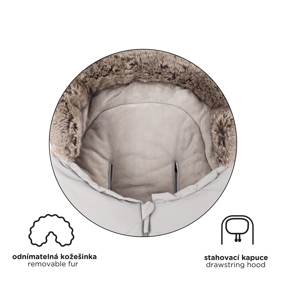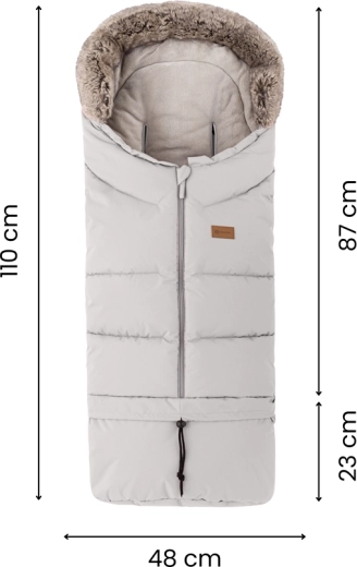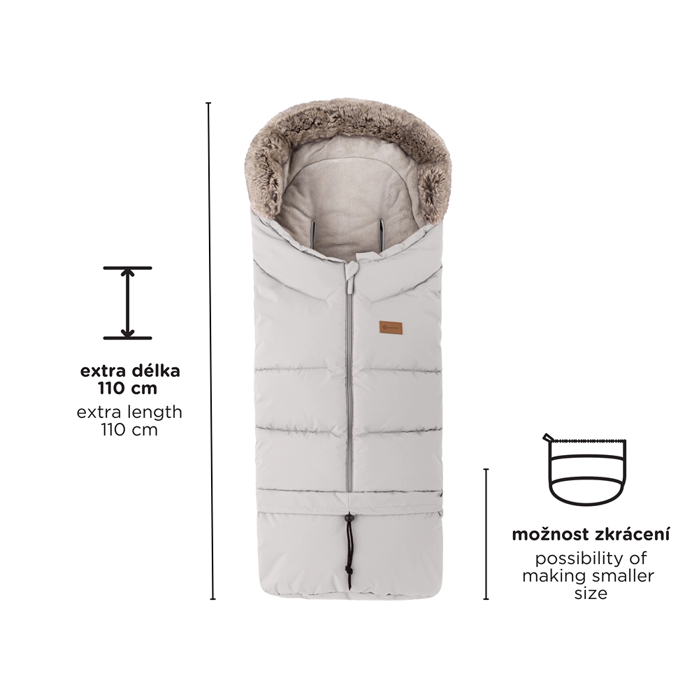 Køreposen forkortes nemt ved at lyne underdelen af til lift eller autostol; i fuld længde 110 cm er den ideel til klapvogn. Den pelsede krave fungerer som vindbeskyttelse.