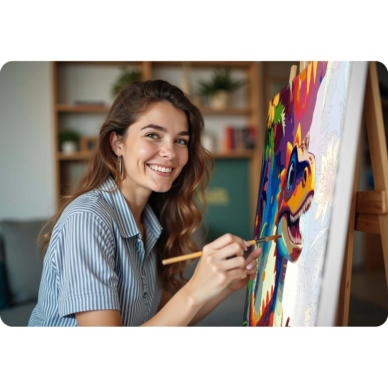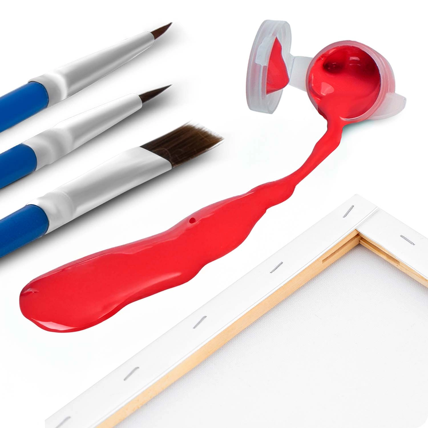 Komplet sæt til øjeblikkelig maling – forgrundet lærred på ramme, op til 30 mættede akrylfarver, 3 pensler i forskellige størrelser og ophængningshardware.
