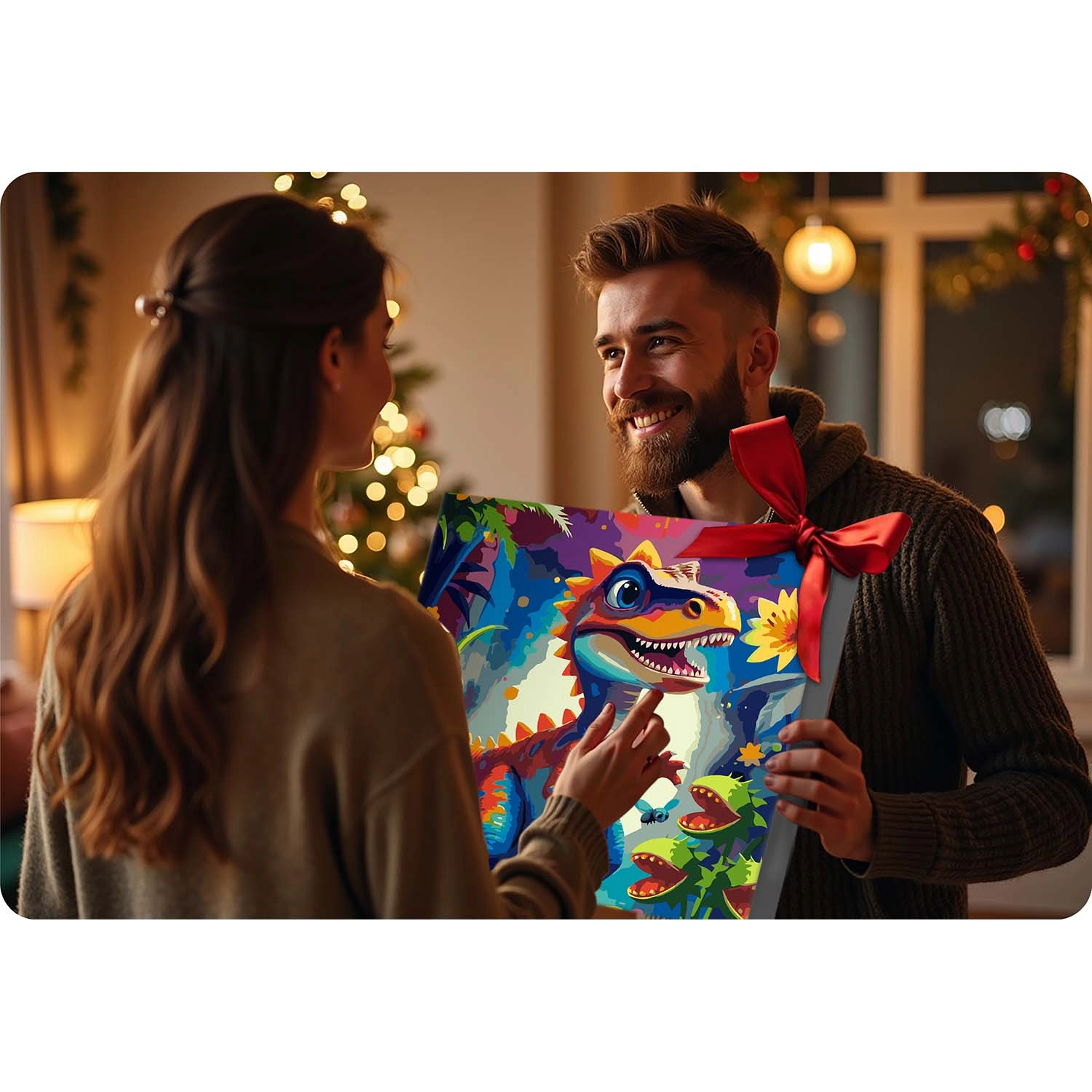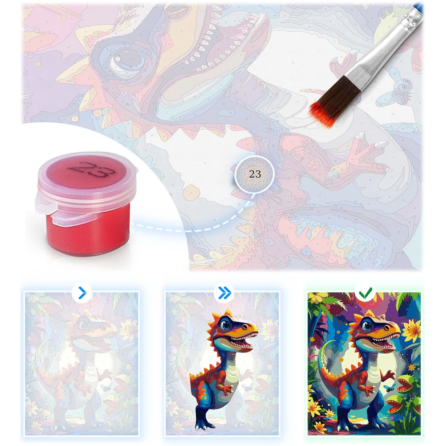 Opdag glæden ved at skabe med et maleri efter tal 40 × 50 cm med dinosaurmotiv. Sættet indeholder alt, hvad du behøver: forgrundet lærred på ramme, op til 30 dækkende akrylfarver, 3 pensler i forskellige størrelser og kroge til ophængning. Takket være farvet underlag med fine linjer klarer selv begyndere malingen, og resultatet får intense farver og fuld dækning uden gennemskinnende streger.