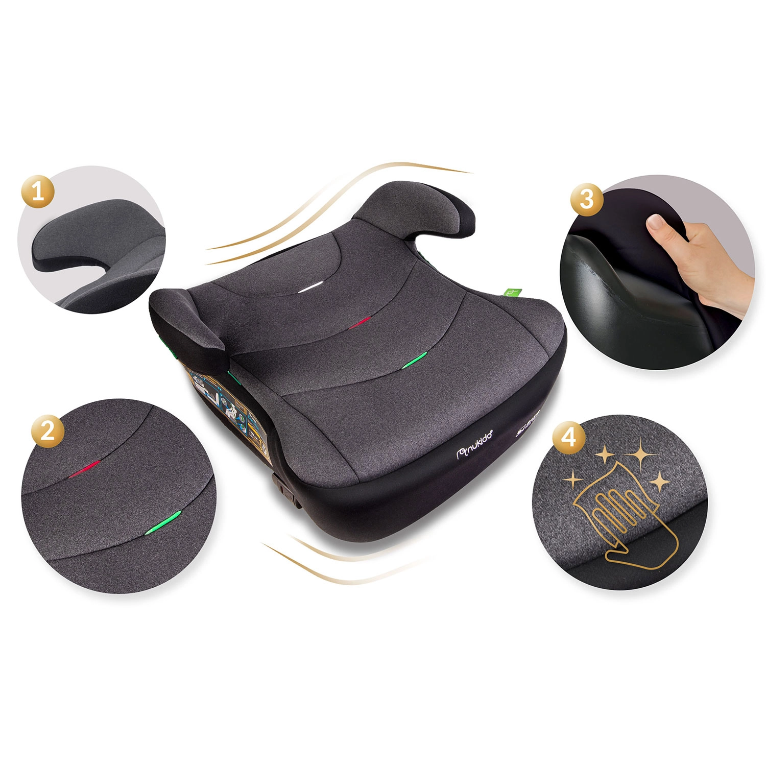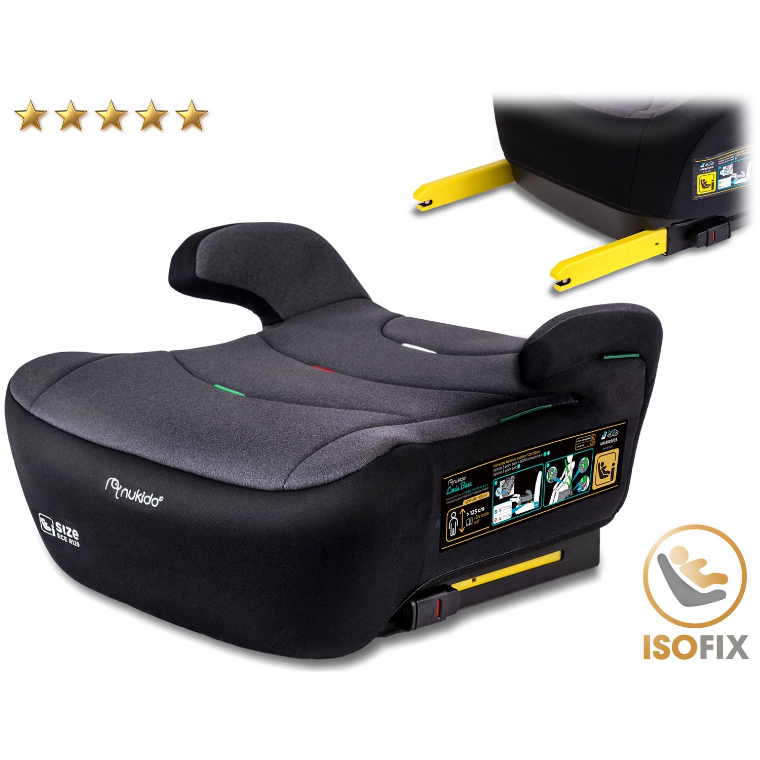 NUKIDO Louis i-Size er en kvalitets-sædepude til større børn, der kombinerer topklasse sikkerhed, ergonomi og lang levetid. Montering med Isofix og bilens sikkerhedssele sikrer en fast forbindelse til sædet og korrekt sedeføring på hver tur. Det bløde, dybe og brede sæde med rigelig polstring giver komfort selv på længere stræk.