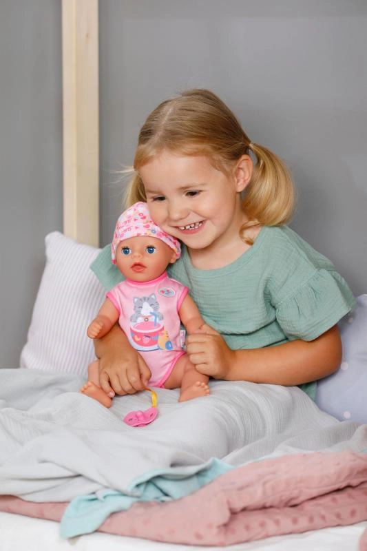 Sutten, der er fastgjort til sparkedragten med et sødt kattemotiv, gør det muligt for dukken at åbne og lukke øjnene også når hun sidder. Når hun lægges i sengen, lukker hun øjnene selv, som om hun virkelig sover. Bevægelige arme og ben samt et drejeligt hoved gør påklædning og afklædning let, så små omsorgspersoner kan klare det hele selv.