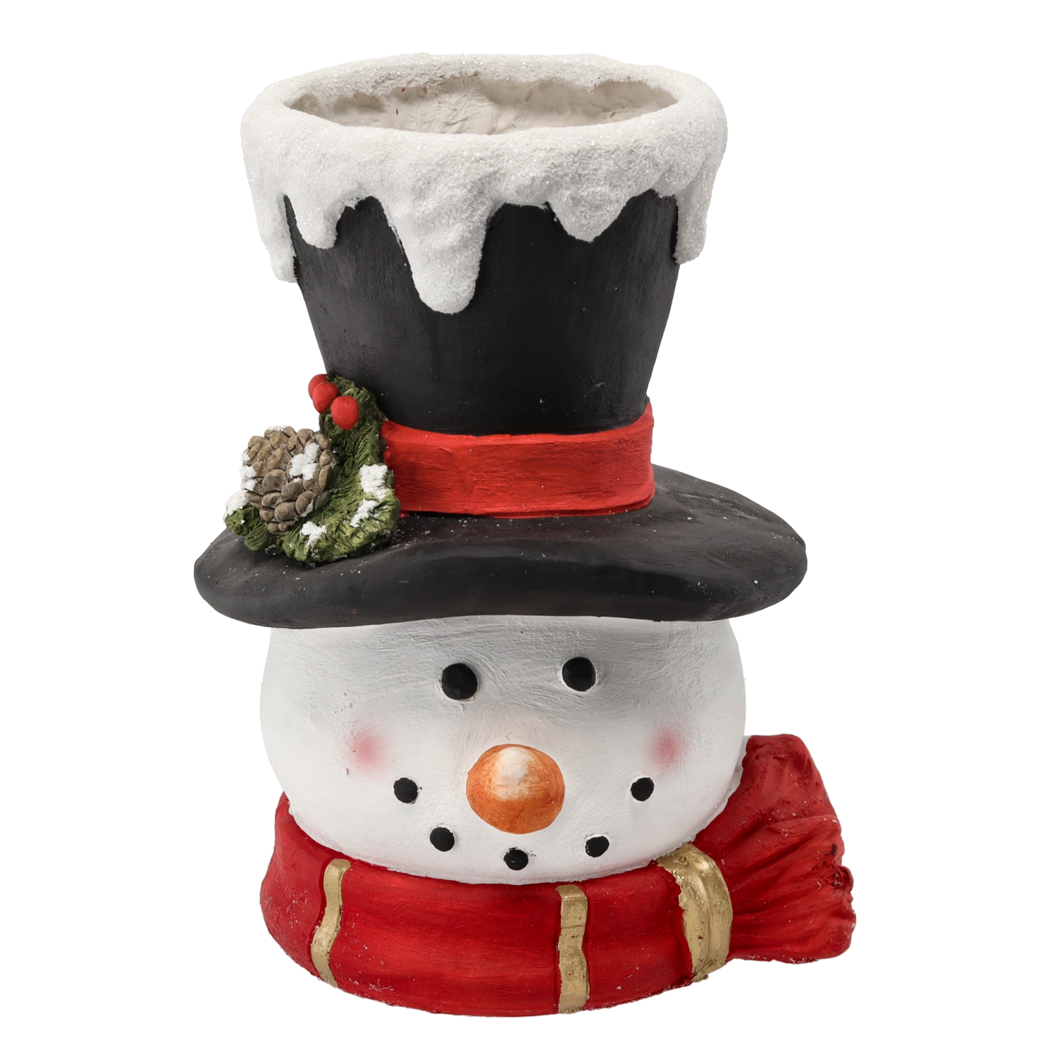 Denne elegante julevase i form af et snemands-hoved bringer en glædelig, højtidelig atmosfære ind i hjemmet. Omhyggeligt udførte detaljer – øjne, næse, mund og let lyserøde kinder – understreger dens charme. Åbningen i den øverste del af hatten er ideel til friske blomster, grene, tørrede dekorationer eller lyskæder.
