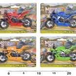 Lille, men hurtig! Denne racermotorcykel på 11 cm vil begejstre enhver hastighedsentusiast. Takket være friløbshjul kører den let og jævnt over gulvet og er ideel til børneløb og til hjemmets samling. Fås i 4 glade farver – blå, grøn, rød og gul.