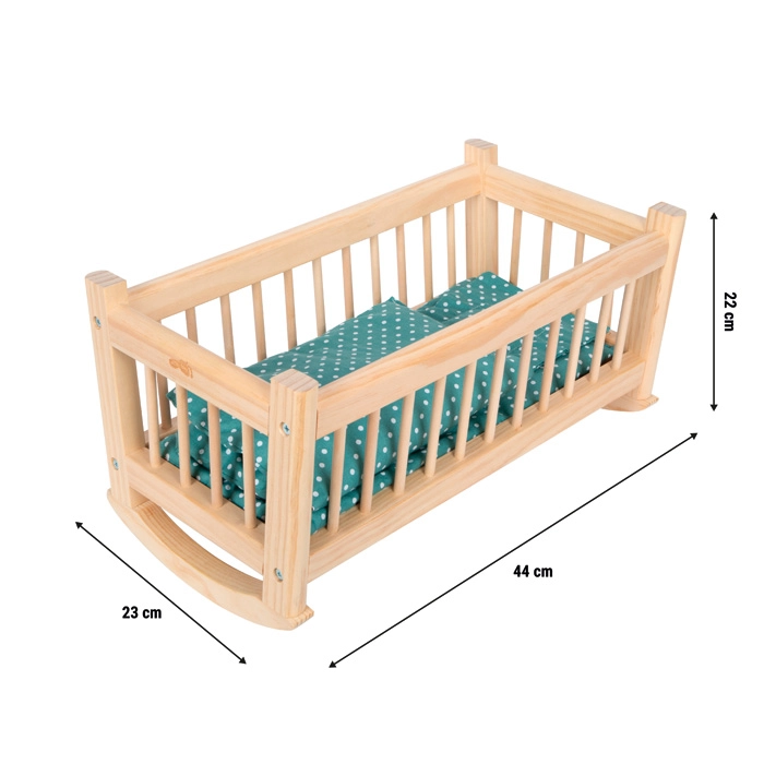 En stilfuld trævugge til dukker fra SMALL FOOTnaturligt udseende, tidløst design og blid vuggen for rolig putning af dukker og bamser. Takket være den stabile konstruktion, afrundede kanter og medfølgende sengetøj (dyne, pude, lagen) tilbyder den sikker og behagelig leg, som udvikler fantasi, sociale færdigheder og finmotorik.