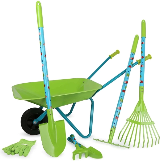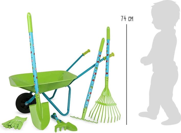 Dette store havesæt til børn fra SMALL FOOT indeholder alt, hvad den lille gartner behøver: stabil trillebør, spade, rive, løvrive, lille rive, håndskovl og beskyttelseshandsker. De fleste dele er af metal, så de er stærke og holdbare, men samtidig lette og nemme at håndtere for børnehænder.