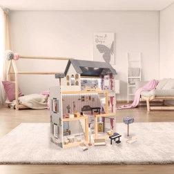 Stilfuld dukkestue i MDF-træ i elegant sort farve med tre etager fulde af sjov, et rigt sæt møbler og stemningsfuld LED-belysning. Takket være den solide MDF-konstruktion er den stabil og holdbar, mens 16 møbeldele gør det muligt kreativt at indrette køkken, stue, soveværelse, badeværelse og tagterrasse.