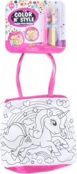 Kreativt sæt til små kunstnere: farvelægningshåndtaske på ca. 16 × 16 cm, som indeholder 4 specielle tekstiltuscher og dekorative sten. Ideel til at udvikle kreativitet, finmotorik og en original stil. Velegnet til børn fra 3 år.