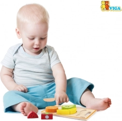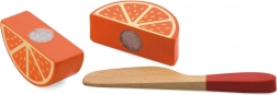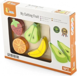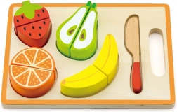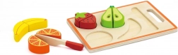 Sættet indeholder skærebræt, trækniv og forskellige stykker farverig frugt, der ligger godt i små børnehænder. Den robuste trækonstruktion og glatte kanter sikrer lang holdbarhed og sikker leg.