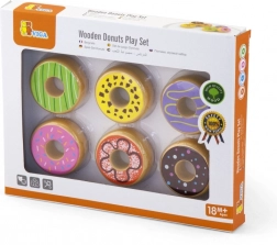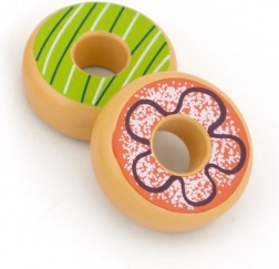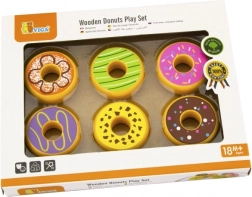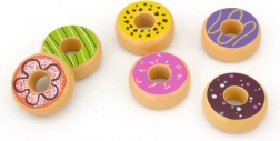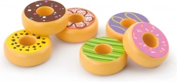 Legesæt med seks trædoughnuts til børn fra 18 måneder, der understøtter finmotorik, fantasi og rolleleg som butik eller café. Hver doughnut har et unikt farverigt design og en behageligt glat overflade for sikker håndtering.