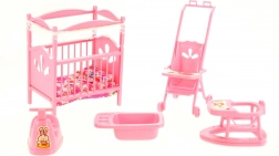 Det komplette GLORIE-sæt til et lille dukke-børneværelse vil glæde enhver lille omsorgsperson. Her finder du en barneseng med dyne og pude, en barnevogn, et gåstativ, en potte og en badebalje – alt i holdbar plast og i størrelser, der er ideelle til leg. Perfekt til udvikling af fantasi og rolleleg. Velegnet fra 3 år.
