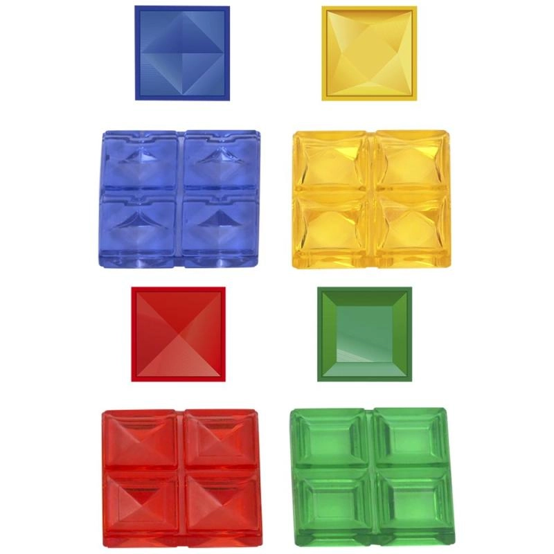 - 1 spilleplade med gitter, 4 sæt á 21 brikker (gul, rød, blå, grøn)