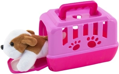 Dette sæt kombinerer en blød plyshund og en let plastboks med ventilationshuller og håndtag for nem transport. Børn kan lege at passe dyret, tage det med på tur og lægge det til at sove – alt sammen på en sjov og sikker måde.