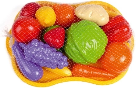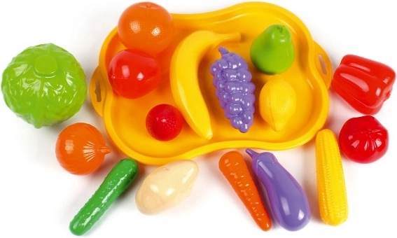 Plastik sæt med frugt og grøntsager giver en fremragende mulighed for børn at lære at genkende forskellige madtyper. Sættet indeholder efterligninger af frugt og grøntsager på en solid gul bakke. Understøtter kognitiv udvikling og hjælper børn med at forstå grundlæggende sund kost.