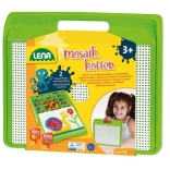 Den transportable kuffert med mosaik fra mærket Lena tilbyder utallige muligheder for sjov og lærerig leg. Pladen, der er en del af sættet, gør det muligt at indsætte piggene i mosaikmønstre, hvilket støtter udvikling af fantasi, koncentration og finmotorik. Sættet indeholder: