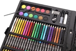 Sættet indeholder et bredt udvalg af kunstnerartikler, fra farveblyanter til akvarelfarver, hvilket gør det ideelt til forskellige kreative projekter.