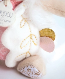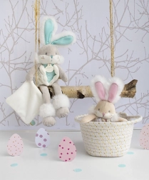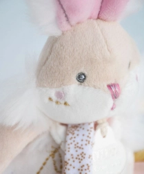 Denne bløde kanin kombinerer tre funktioner i én: krammeven, blid rangle til hørelsesudvikling og sutteholder, som sørger for, at sutten altid er tæt på. Premium, blød plys sikrer en behagelig følelse og trygge kram allerede fra de første leve dage.