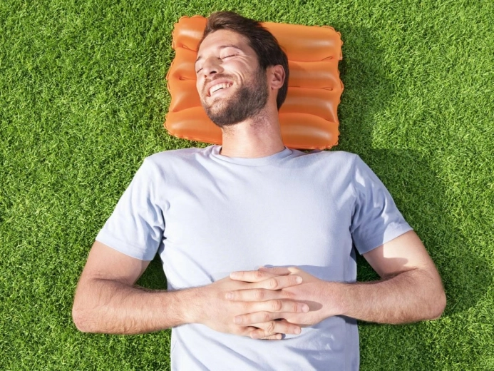 Puden er udstyret med en sikkerhedsventil, der forhindrer ufrivillig luftlækage. Ergonomiske riller på overfladen øger komforten, både når du ligger og sidder. I løbet af dagen fungerer den som en blød underlagspude, og om natten som en praktisk hovedpude – uden behov for pumpe.