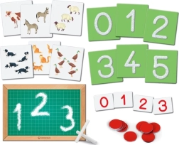 10 Karten mit rauen Zahlen, 11 Zahlenkarten, 57 Chips, Tafel, Kreide, Schwamm zum Wischen, 11 Karten mit Mengen
