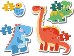 Kinder ab 2 Jahren können das Zusammensetzen der ersten Puzzle mit Dinosaurier-Thema genießen. Jedes Puzzle enthält eine unterschiedliche Anzahl von Teilen - 2, 3, 4 und 5, was eine schrittweise Verbesserung und den Erwerb neuer Fähigkeiten ermöglicht.