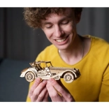 Das Modell besticht durch einen detaillierten Innenraum, öffnende Seitentüren, ein manuell bedienbares Festdach mit Schiebedach und ein funktionierendes Reserverad im Kofferraum. Im Set ist alles enthalten – die Teile sind vorgestanzt und der Zusammenbau gelingt mit der bebilderten Anleitung in 11 Sprachen. Belassen Sie das natürliche Holz oder bemalen Sie das Fahrzeug nach Ihrer Fantasie.