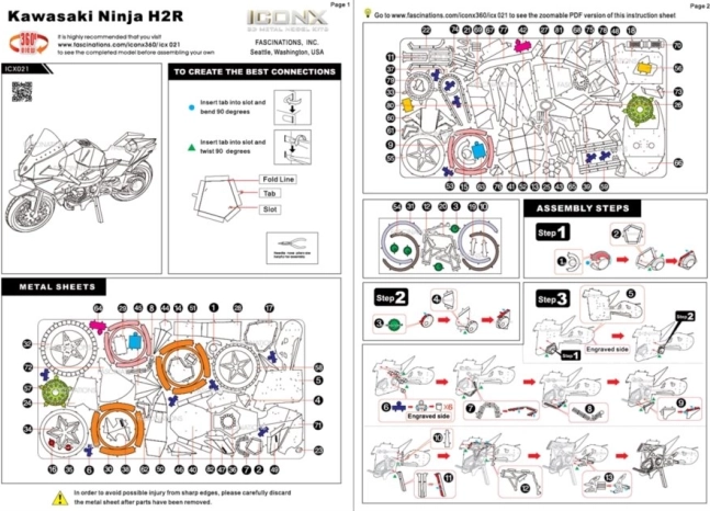 Entnehmen Sie die einzelnen Teile aus den Metallblechen; bei Bedarf verwenden Sie kleine Seitenschneider (nicht enthalten). Die Teile werden mittels Verriegelungen verbunden, die aus einem Haken (Nase) und einer Öffnung bestehen. Biegen Sie die Nase mit kleinen, feinen Zangen (nicht enthalten) um und verbinden Sie nach und nach alle Verriegelungen, bis ein äußerst realistisches Meisterstück entsteht!