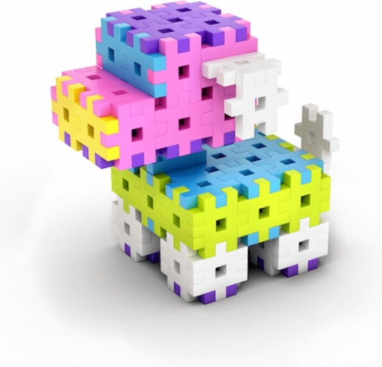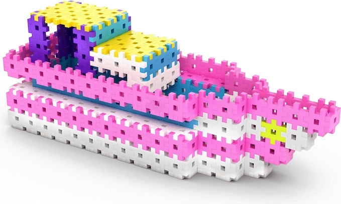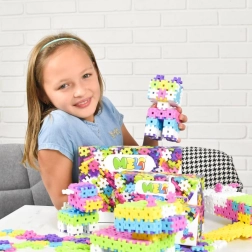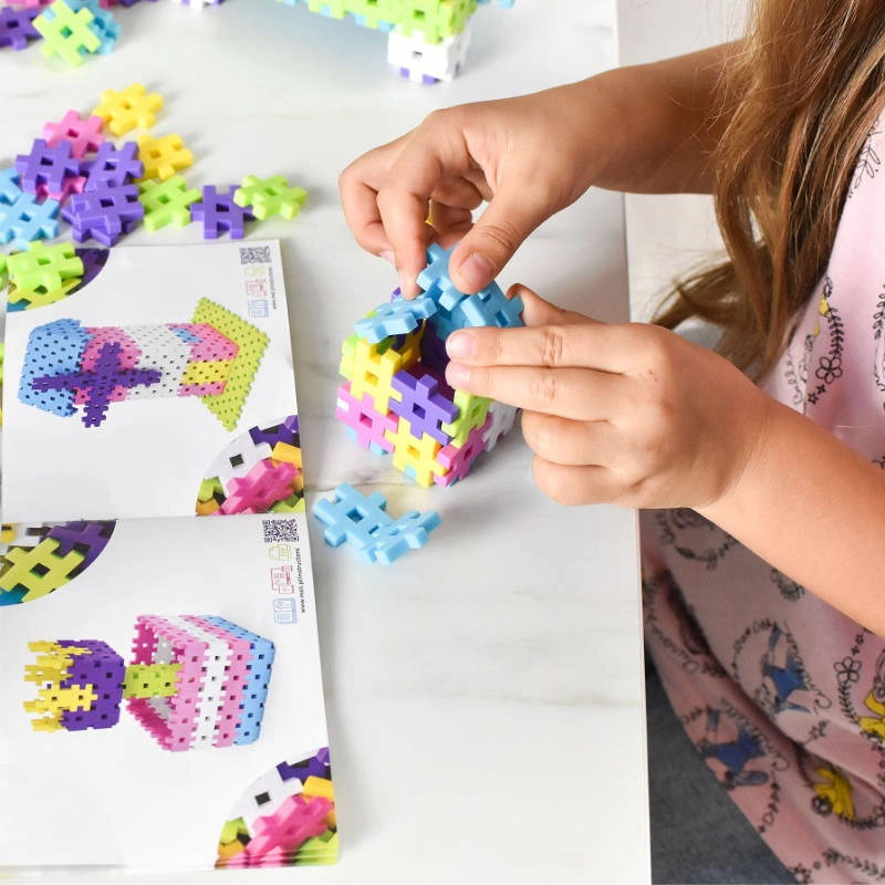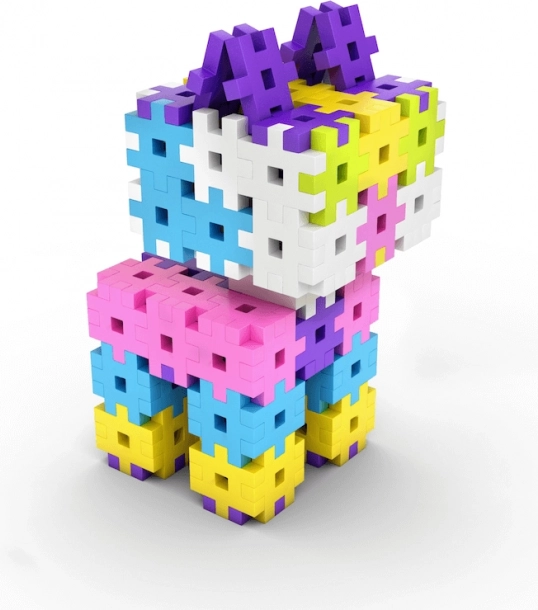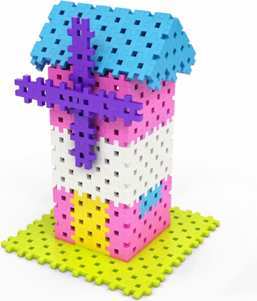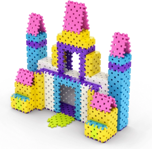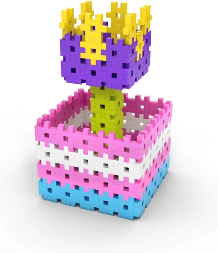 Die Bausteine fördern Greifen, Hand-Auge-Koordination und Vorstellungskraft. Die Pastellpalette mit Schwerpunkt auf Rosa und Lila motiviert Kinder zum Gestalten. Im Lieferumfang enthalten ist ein Ideenheft, das zu weiteren Modellen inspiriert; für noch stabilere Konstruktionen kann eine Grundplatte ergänzt werden.