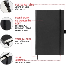Dieses stylische Notizbuch ist ein zuverlässiger Begleiter für Arbeit, Schule und Freizeit. Harte Umschläge mit strapazierfähiger Oberfläche schützen Ihre Aufzeichnungen, während das elastische Gummiband sie sicher zusammenhält. Das kompakte A5‑Format passt in die meisten Taschen und Rucksäcke, sodass Sie es stets zur Hand haben.