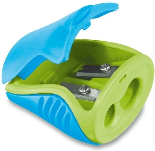 Genießen Sie sauberes und bequemes Anspitzen zu Hause, in der Schule und unterwegs. Dieser Kunststoffspitzer mit Behälter und zwei Öffnungen hält die Späne sicher im Inneren, während der fest sitzende Deckel das Ausschütten verhindert und den Inhalt des Mäppchens sauber hält.