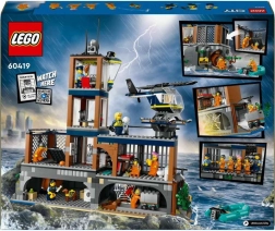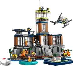 Die Gefängnisinsel auf der Klippe ist das Epizentrum der Abenteuer: Leitstelle, Bereich für Polizisten, Eingangshalle, Hof mit geheimer Falltür, Tierbereich, Zellen mit Betten und einem Tunnel zur verlassenen Mine sowie eine Wäscherei mit Werkzeugen für clevere Ausbrüche. Nicht fehlen dürfen Heliport, Polizeiboot, Ponton und die dramatische Felsklippe mit lösbaren Felsbrocken für Filmszenen.