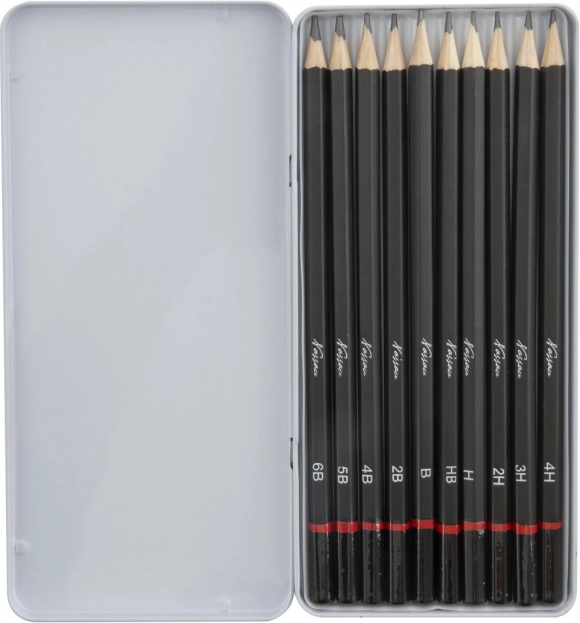Das Set mit 10 Graphitstiften deckt den gesamten Bereich für kreatives Arbeiten ab: von weichen Stiften für satte Schatten und expressive Striche bis hin zu harten für feine Details und technische Linien. Das beiliegende Metalletui schützt die Stifte beim Transport und sorgt für Ordnung im Atelier und in der Schule.