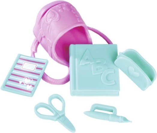 Enthält Schulmaterialien wie Heft, Schere, Federmäppchen, Stift und Lehrbuch für realistisches Spiel.