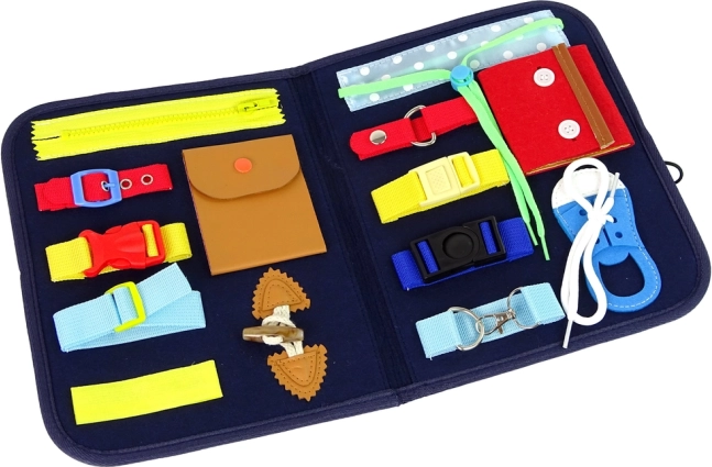 Das Brett enthält eine Reihe von Elementen in verschiedenen Formen und Texturen, die helfen, das haptische Empfinden zu verbessern. Es enthält verschiedene Verschlussarten wie Knöpfe, Schnallen und Schnürungen, die die kindliche Kreativität anregen und das selbstständige Bewältigen von Alltagssituationen fördern.
