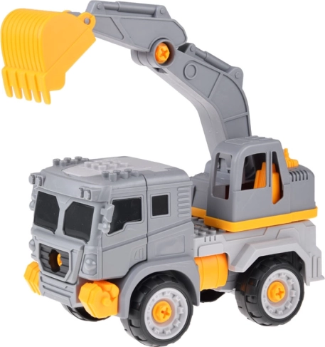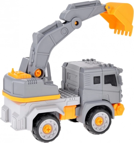 Enthalten sind ein Schraubendreher und eine Ersatzschraube. Kinder können Räder, Frontmaske, Kabine mit Arm sowie Schaufel abschrauben und alles wieder zusammenbauen.
