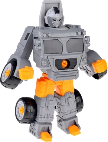 Die Transformation ist einfach und macht Spaß: Klappen Sie die Vorderräder zur Seite (sie werden zu Armen), lösen Sie den Kopf, der vordere Teil der Kabine wird zum Rumpf und durch Herausziehen des hinteren Fahrzeugteils entstehen die Beine. Die Räder müssen nicht entfernt werden, bieten aber als zusätzliche Herausforderung noch mehr Spielspaß.